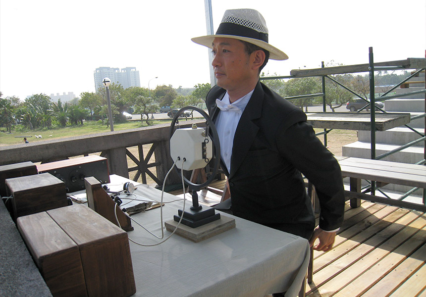 実況アナウンサー役の斉藤一美さん、セットの放送席に座っていささか緊張気味。普段のお仕事場である現代の「放送席」とは全く違う機材に興味津々でした。この機材はもちろん小道具ですが、とてもよくできています。こんなマイクの形だったんですね。レトロ(当たり前ですが)で素敵です。